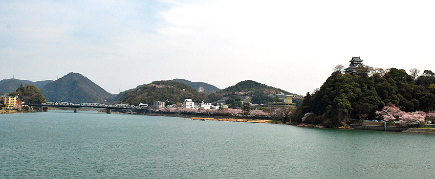 名鉄 犬山遊園駅より木曽川左岸の川沿いの桜並木を西に進むと正面の小高い断崖上に三層四階の望楼型の天守がそびえる城が見えてきます。